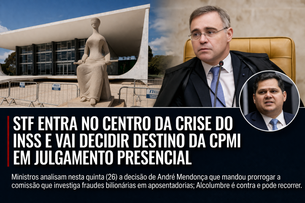 O Supremo Tribunal Federal (STF) deve analisar nesta quinta-feira (26), em sessão presencial do plenário, a decisão do ministro André Mendonça que determinou a prorrogação da CPMI do INSS. O caso ganhou peso político em Brasília porque envolve um embate direto com o presidente do Congresso, Davi Alcolumbre, que resiste à continuidade dos trabalhos da comissão.